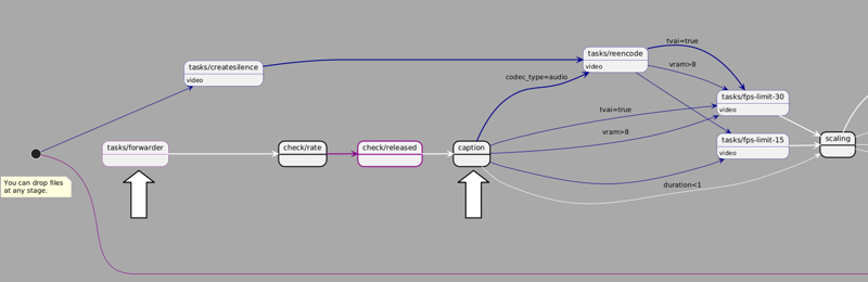 一部のステージは、事前定義されたブループリントに基づいてユーザー自身で作成できるため、ニーズに応じてツールを拡張可能です。これは、繰り返し行う必要があるが単純なタスクをパイプラインのどこかに統合したい場合に非常に便利です。簡単なffmpegタスク用のimg2imgおよびvid2vidブループリントがいくつか用意されています。