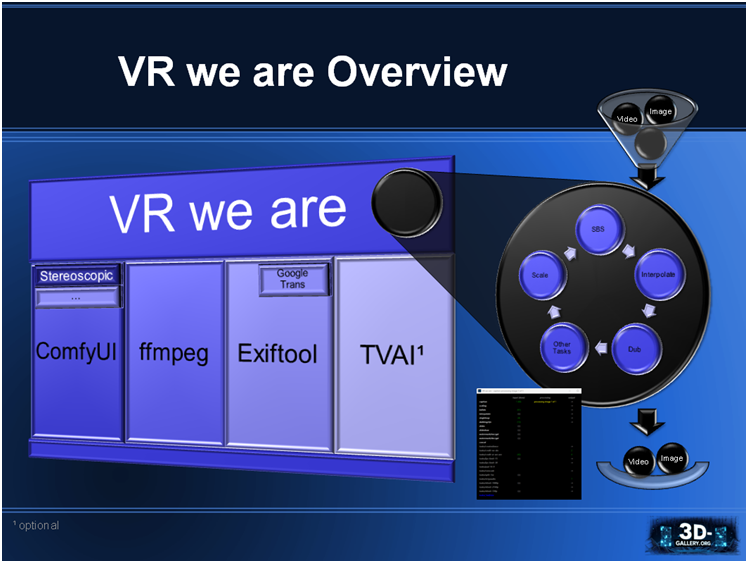 「VR we are」はこれを配布・実行プラットフォームとして使用しています。- Stereoscopicは、ComfyUI用のカスタムノードパッケージで、「VR we are」ソフトウェアを含んでいます。カスタムノードの開発には、iablunoshka氏の支援を受けており、SBS変換器とCLIの高性能を実現しました。初期テストではSamSeenのノードを使用していました。