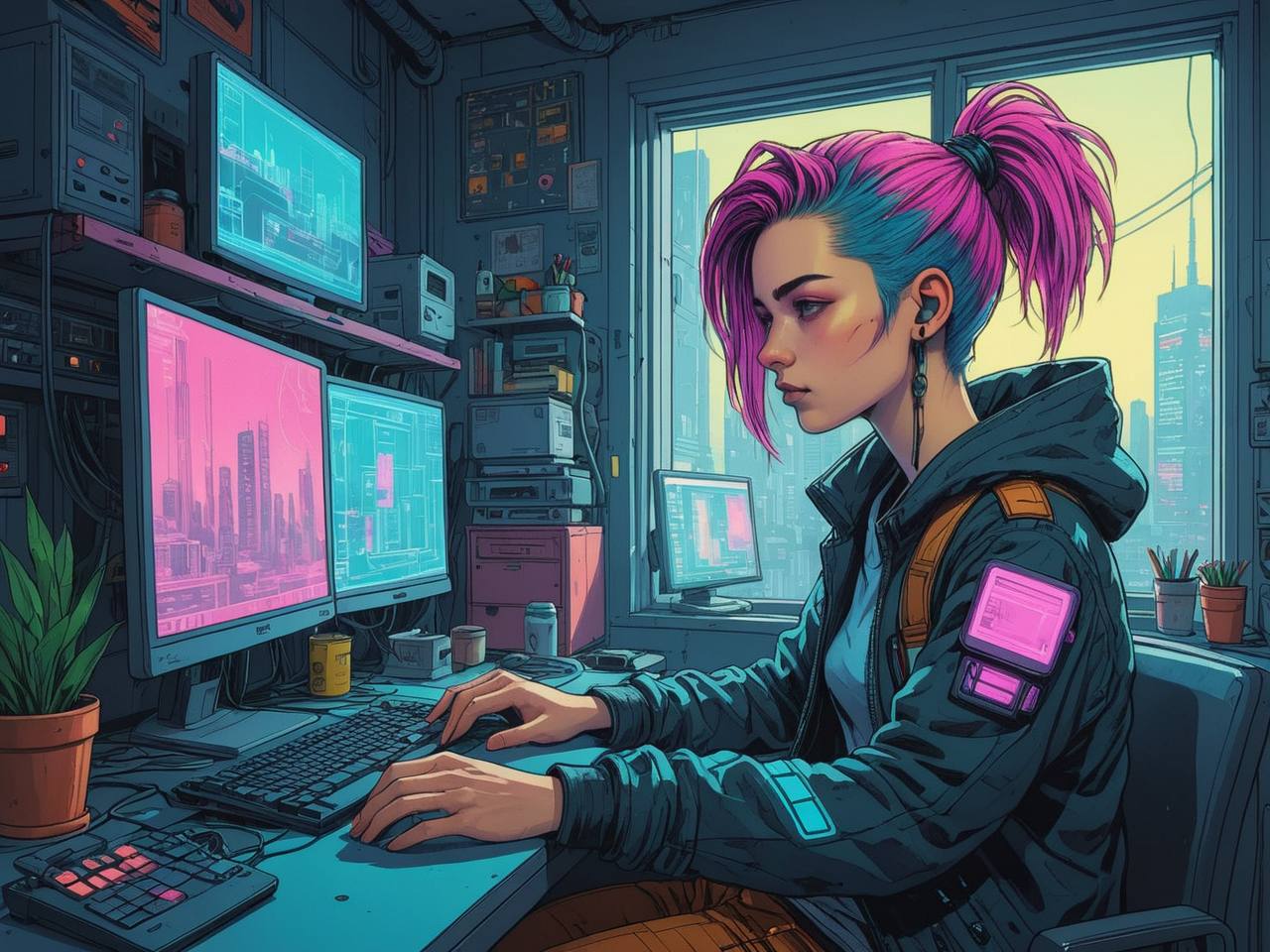 부드러운 사이버펑크 스타일로, 사이버펑크 요소가 포함된 이미지로 학습되었지만 다른 덜 사이버펑크 스타일의 이미지도 생성 가능합니다. 효과를 줄이려면 "사이버펑크"를 생략하세요.