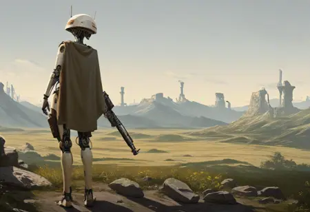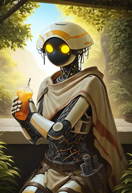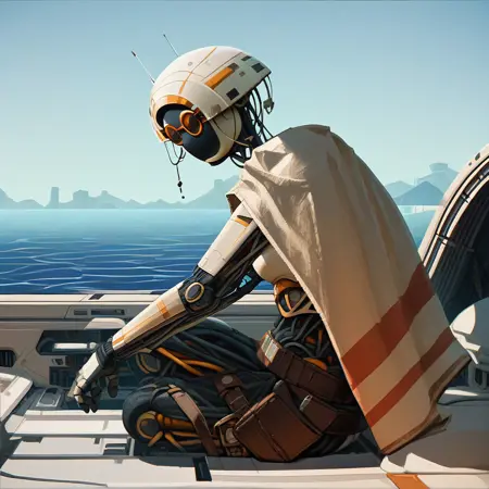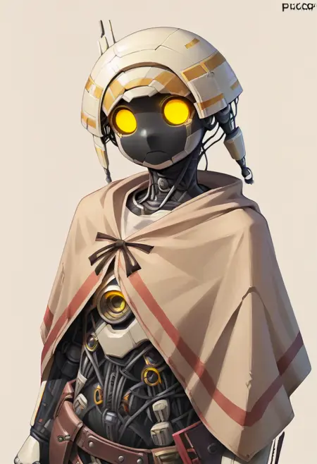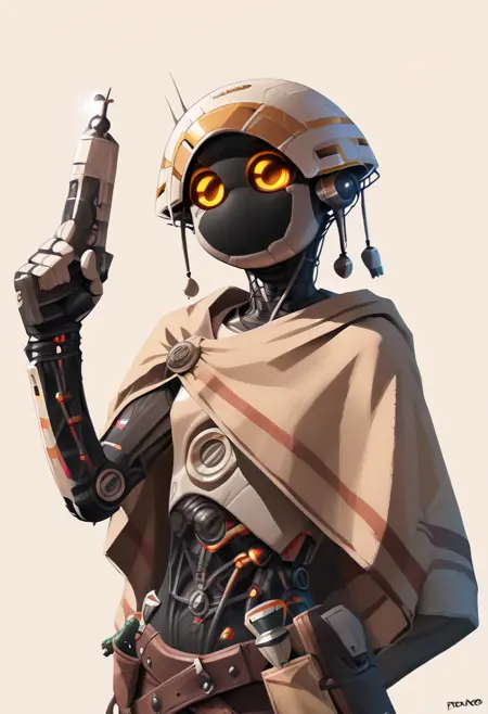 yellow eyes, helmet, humanoid robot, faceless, no mouth, no nose, poncho, holster,