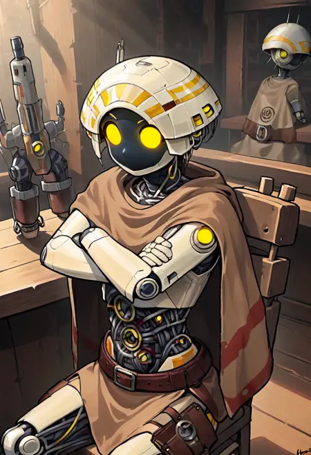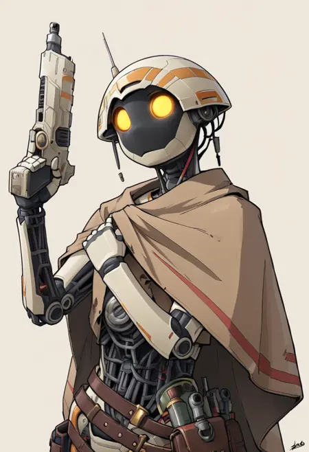 额外标签:黄色眼睛、头盔、类人机器人、无脸、无嘴、无鼻子、斗篷、枪套