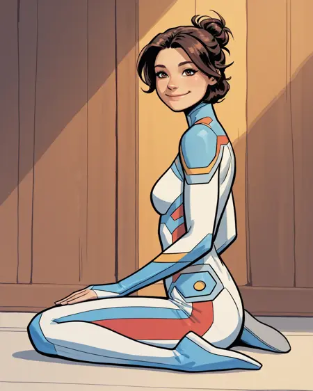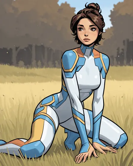 トリガー: _jittermarvel, 1girl, ブラウンヘア, ヘアバント, ブラウンアイズ, ボディスーツ