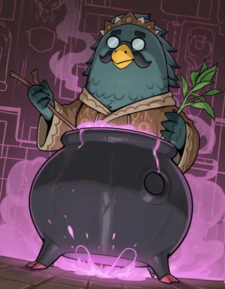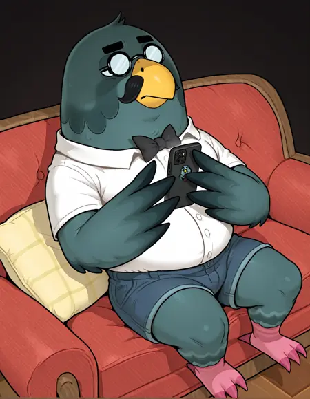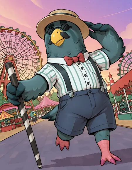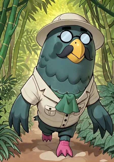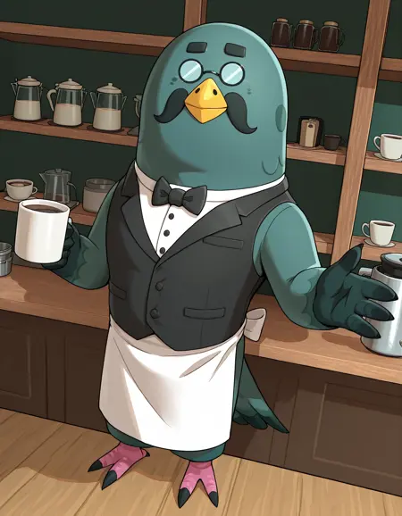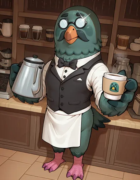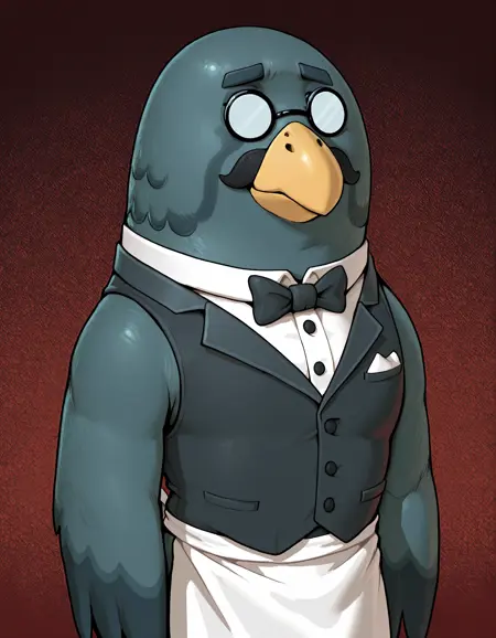 Brewster, brewster \(动物森友会\),黄色喙,黑色胡须,秃头,眼镜,小眼镜,不透明眼镜,圆框眼镜,管家,黑色背心,黑色领结,白色领子,白色围裙,厨师裙