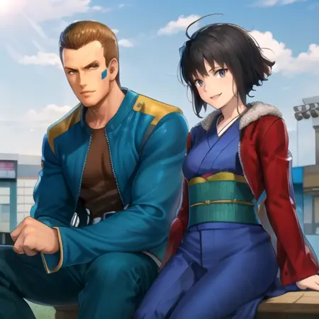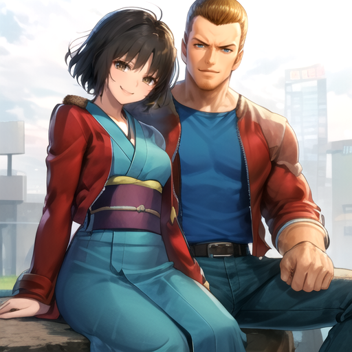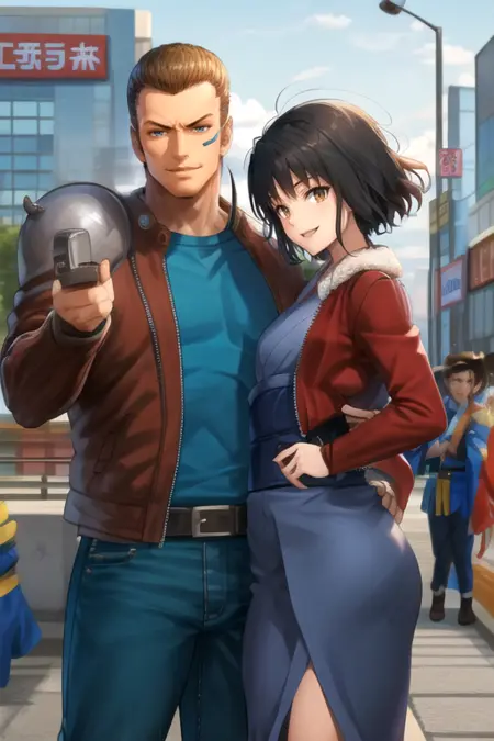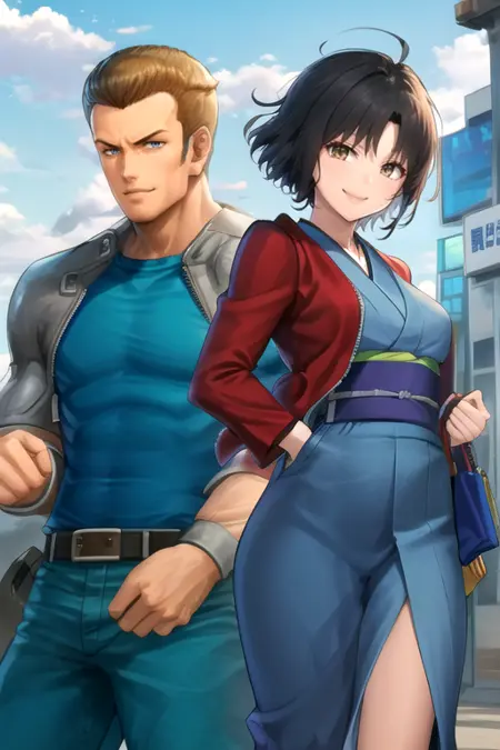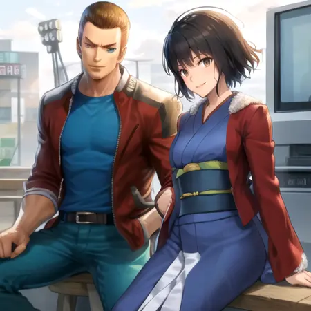 BrianShiki, a man and (a woman, blue kimono, red jacket), hetero, standing, smile, cowboy shot