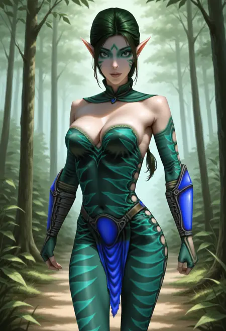 bodysuit, collar, green gem, blue loincloth, long fingerless gloves, blue bracers