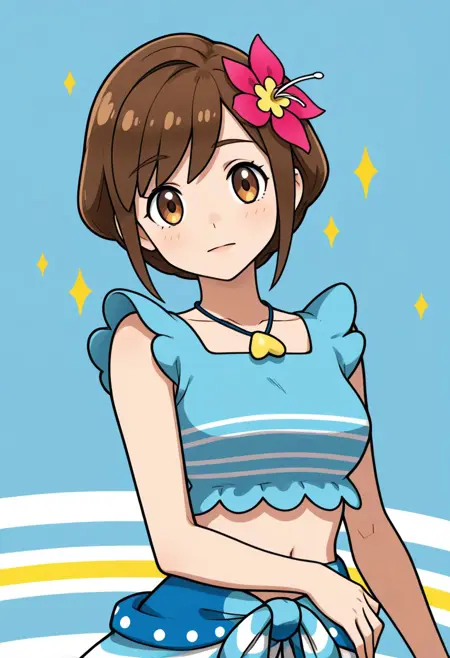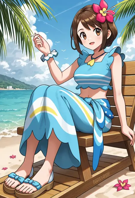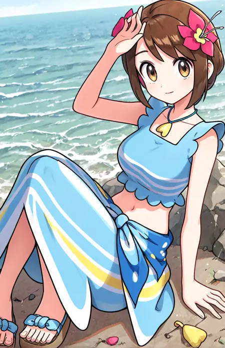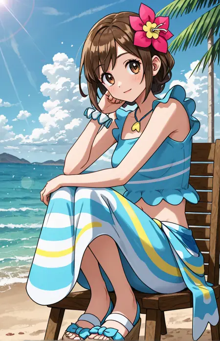 hair flower, pink flower, hibiscus, sleeveless shirt, blue shirt, striped shirt, necklace, midriff, navel, wrist scrunchie, multicolored sarong, blue sarong, sandals