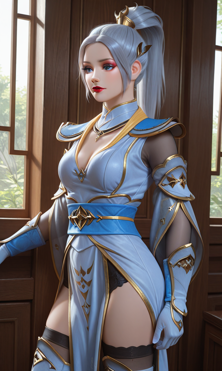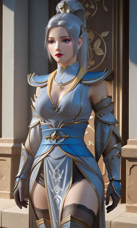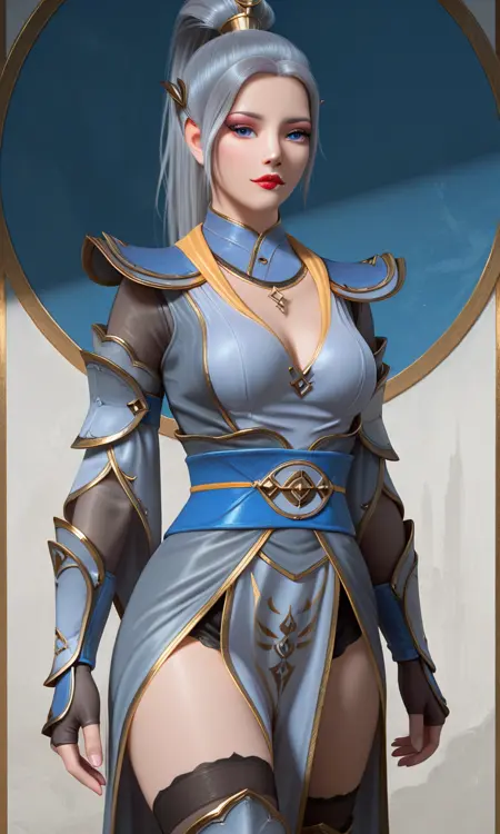 HanYue,1girl,solo,grey hair,long hair,blue eyes,ponytail,hair ornament,makeup, red lips,armor,gloves,dress,grey dress,thighhighs,boots,realistic,