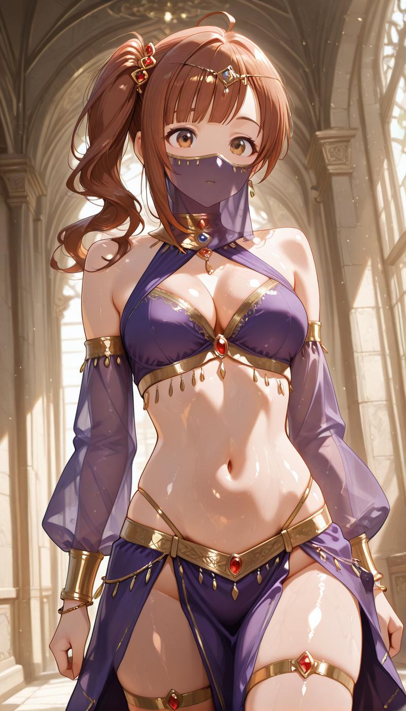 スカート、ロングスリーブ、髪飾り、へそ、リボン、胸元、ジュエリー、肩出し、下着、パンツ、太もも、外れた袖、チョーカー、腹部、お腹、ブレスレット、性器、透け、太ももストラップ、ハイレグ、ハーネック、宝石、ブローチ、露出した服、ベール、骨盤カーテン、腕輪、ゴールドの縁取り、紫のスカート、頭環、ハイレグパンツ、太ももカバー、アームレット、ネックリング、透けた袖、青い宝石、赤い宝石、ダンサー、ハーレム服、アラビア風の服、口ベール、ヘッドチェーン、衣装カットアウト、胸元カットアウト、ショール、紫のブラ、紫の袖、