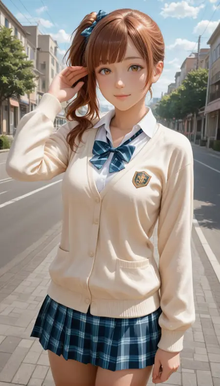 シャツ、スカート、ロングスリーブ、リボン、制服、白いシャツ、髪のリボン、プリーツスカート、衿付きシャツ、ネクタイ、ストライプ柄、赤いリボン、セーター、チェック柄、チェックスカート、カーディガン、ピンクのリボン、赤いネクタイ、シャツをイン、ストライプリボン、ピンクのネクタイ、ピンクのセーター、ストライプネクタイ、ピンクのカーディガン、斜めストライプネクタイ、グレーのスカート、ジャケット、オープンな服、オープンジャケット、黒いジャケット、青いジャケット、ブレザー、ボタン、翼襟、