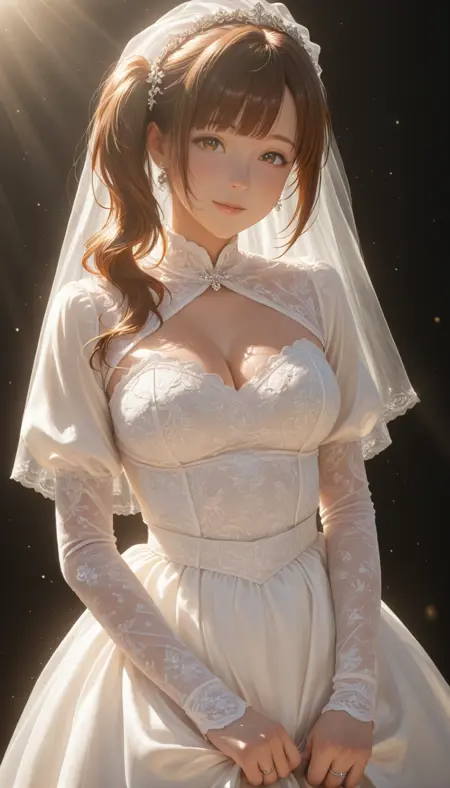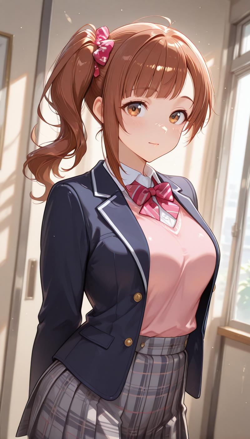 IMIgaraKyoko、ロングヘア、胸、茶色の髪、中程度の胸、茶色の目、ストレートの前髪、サイドポニーテール、あほ毛、非対称ヘア、サイドロックス、