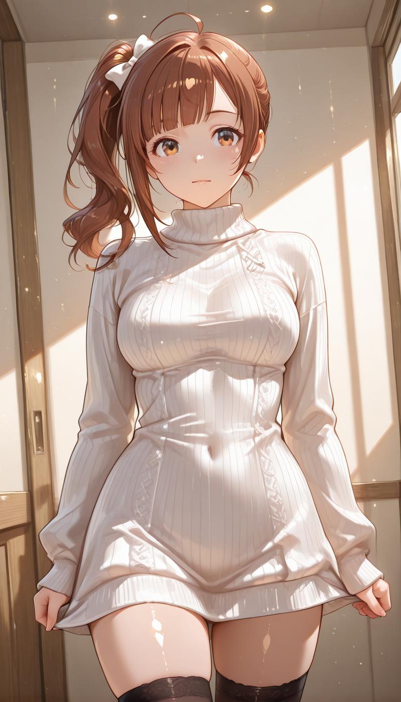 ロングスリーブ、ドレス、ハイソックス、リボン、太もも、髪のリボン、黒いハイソックス、セーター、手首より長い袖、絶対領域、タートルネック、白いリボン、リブ編みセーター、タートルネックセーター、白いセーター、セータードレス、
