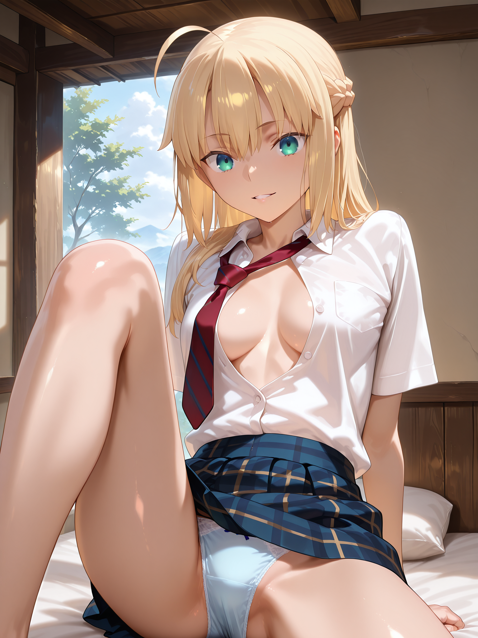 opsh, 1girl, white shirts, open shirts, short sleeves, necktie, partially unbuttoned, necktie, mini skirt,plaid skirt,