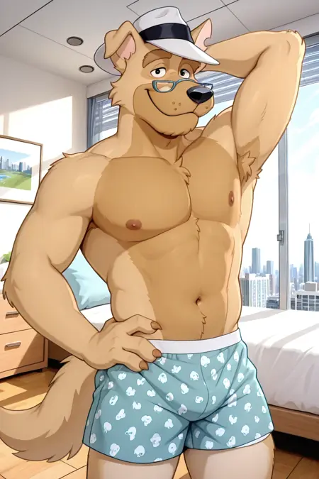 日常服装 - 灰色帽子,白色商务衬衫,紫色外套,棕色裤子,蓝色领带上有黄色花朵,黑色鞋子,红色背带