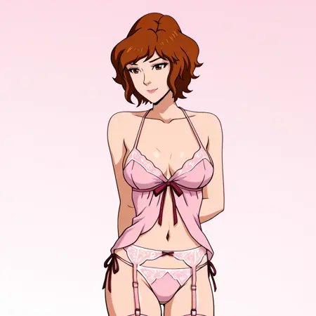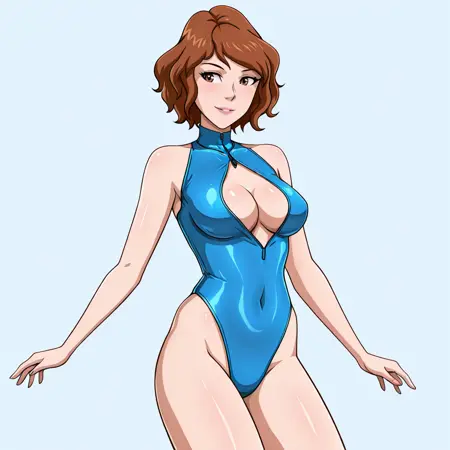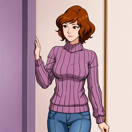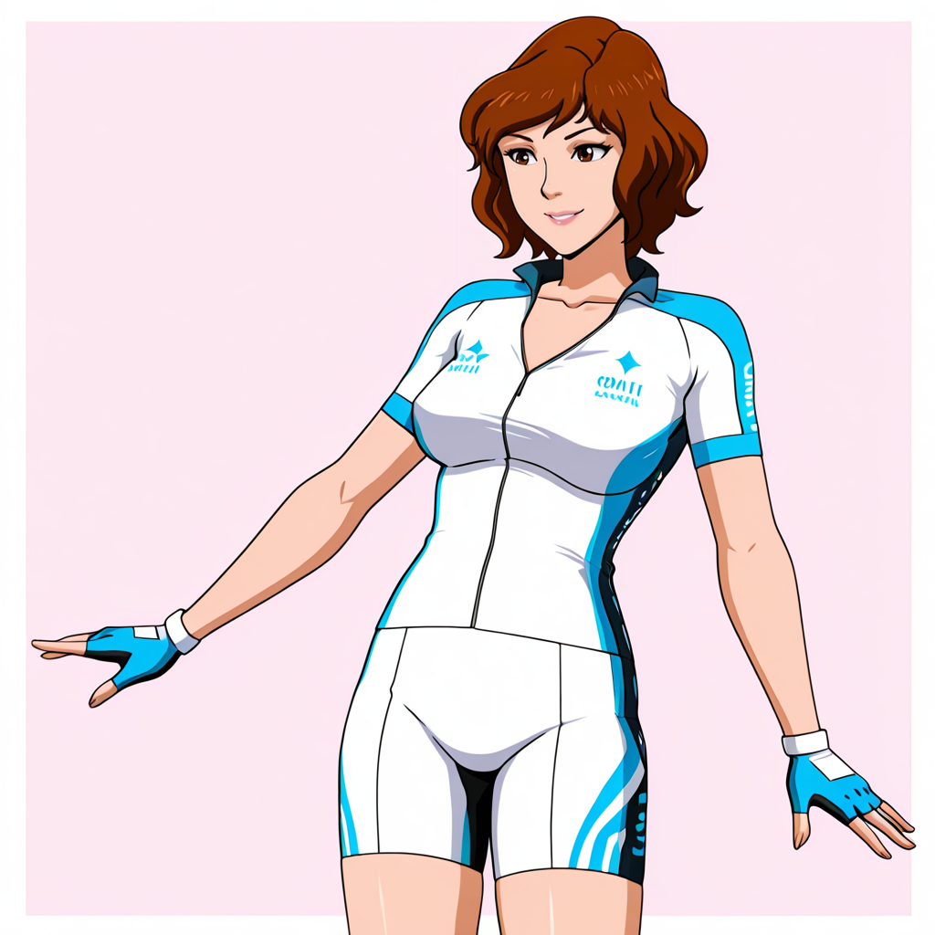 • 트리거: AprilONeil, 1girl, 1980s (스타일), 레트로 아트스타일, 갈색 머리, 단발, 벨트, 점프수트, 검은 눈, 팔찌