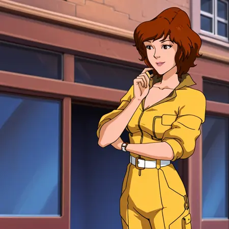 • 현대적인 복장 트리거: AprilONeilModern, 1girl, 갈색 머리, 갈색 눈, 시계, 레트로 아트스타일, 손목 시계, 1980s (스타일), 흰 벨트, 팔 소매 말아올림, 단발, 점프수트, 중간 크기 가슴, 카우보이 샷