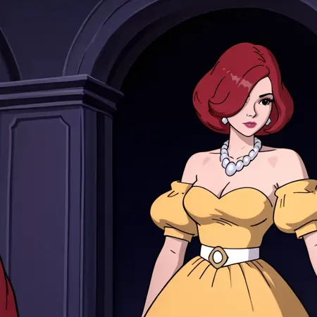 • 노란 드레스 트리거: AprilONeilYellowDress, 1girl, 진주 목걸이, 보석, 어깨 드레스, 붉은 머리, 어깨 드레스, 중간 크기 가슴, 젖가슴, 단발, 노란 드레스, 벨트, 한쪽 눈 위의 머리카락, 검은 눈, 어깨 드러냄, 짧은 소매, 립스틱, 메이크업, 불룩한 소매, 카우보이 샷