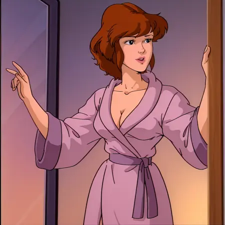 - 带长袍触发词:AprilONeilRobe, 1girl, 复古艺术风格, 棕发, 1980s(风格), 浴袍, 中等乳房, 短发, 深沟, 蓝眼, 长袍, 牛仔镜头