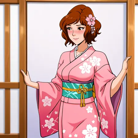 • 로브 트리거: AprilONeilRobe, 1girl, 레트로 아트스타일, 갈색 머리, 1980s (스타일), 목욕 로브, 중간 크기 가슴, 단발, 젖가슴, 파란 눈, 로브, 카우보이 샷
