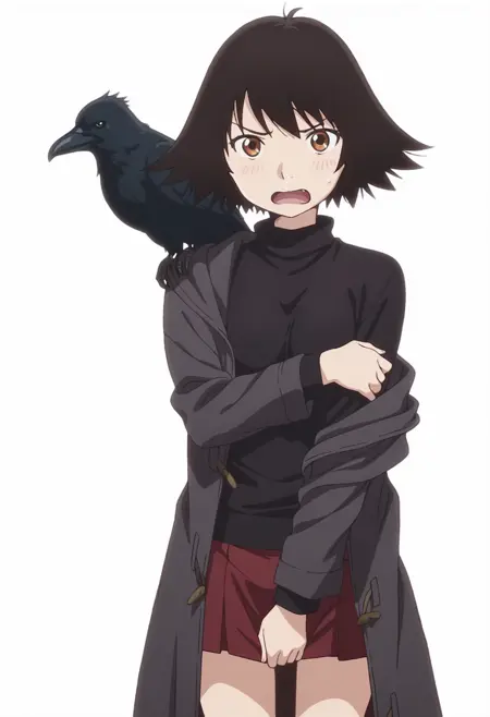 black sweater, turtleneck sweater, red skirt, black coat, open coat, coat partially removed,