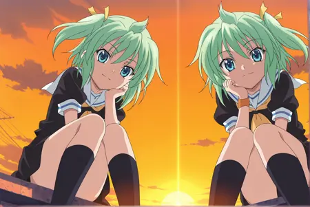 基础 Ile:ile, 1girl, 蓝眼睛, 绿发, 短发, i_侧马尾, i_黄色丝带