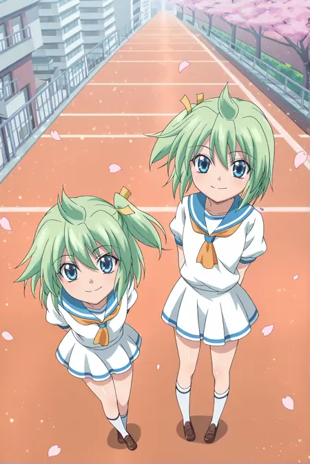Basic Nel: nel, 1girl, blue eyes, green hair, short hair, n_side ponytail, n_yellow ribbon,