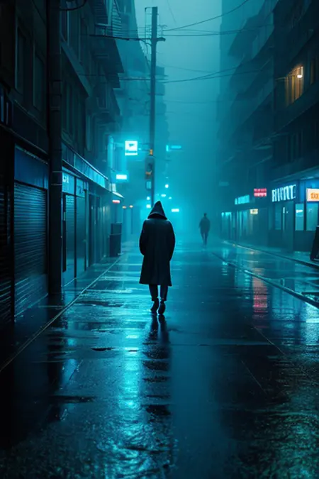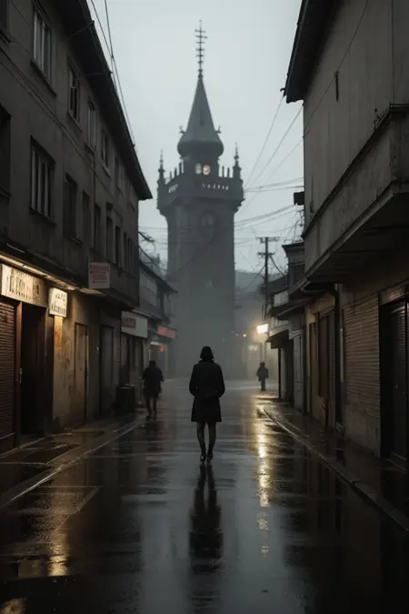 Cinematic photo of a woman walking alone, wearing a hooded coat, misty surroundings, slow motion movement, medium shot, dark forest background, low lighting with fog, back angle, 50mm lens, in style of Gregory Crewdson, <lora:dark-gloomy-v1:0.8>Night photo of an empty street, wet pavement, old street lights glowing dimly, urban silence, symmetrical framing, dark city background, ambient lighting, eye level angle, in style of Edward Hopper, <lora:dark-gloomy-v1:0.8>Wide cinematic shot of a lone car parked under a tree, fallen leaves scattered, quiet atmosphere, slightly tilted frame, moonlit forest background, high contrast shadows, drone angle, in style of Roger Deakins, <lora:dark-gloomy-v1:0.8>