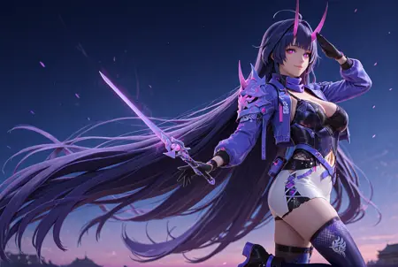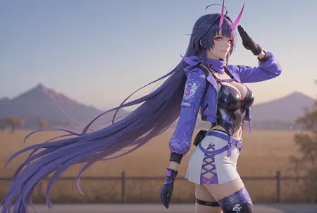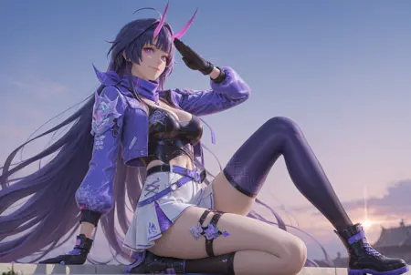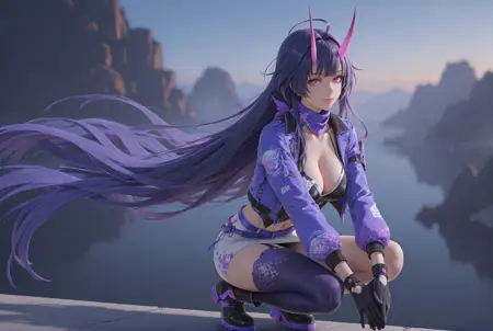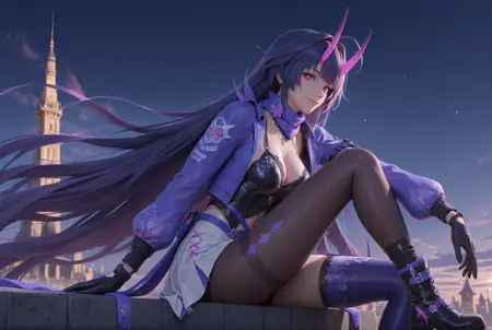 Raiden mei06,1girl,raiden mei \(herrscher of thunder\),raiden mei,solo,long hair,horns,purple eyes,gloves,black gloves,purple hair,jacket,navel,asymmetrical legwear,long sleeves,very long hair,skirt,black footwear,boots,single thighhigh,purple jacket,purple scarf,socks,ahoge,armor,pantyhose,uneven legwear,