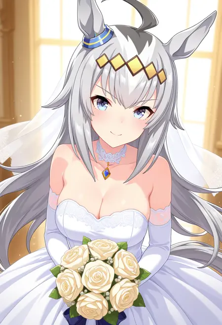 oguri_cap_nekoforge, 1girl, blue eyes, grey hair, multicolored hair, two-tone hair, ahoge, horse ears, horse tail, grey tail, ear ornament, v-shaped eyebrows, breasts, oguri cap (umamusume)