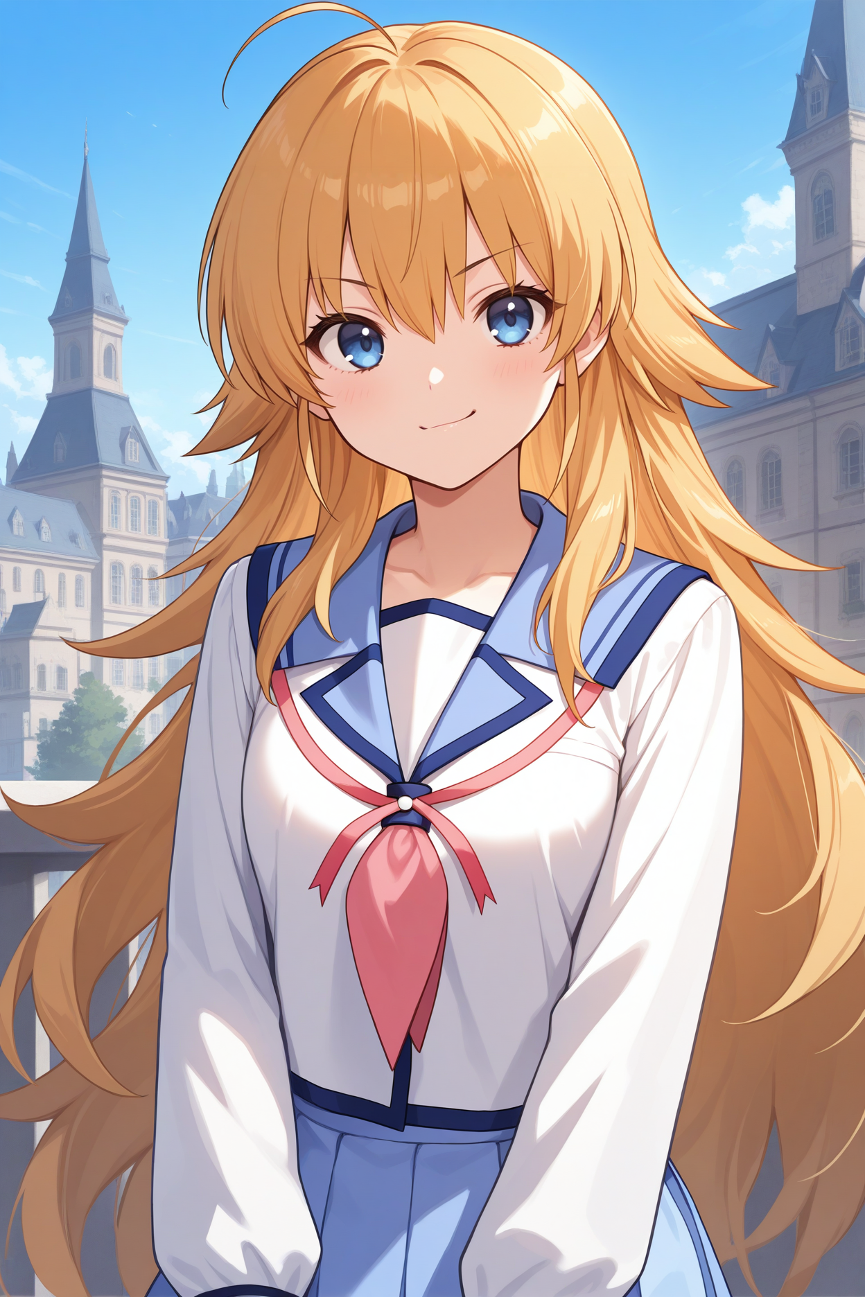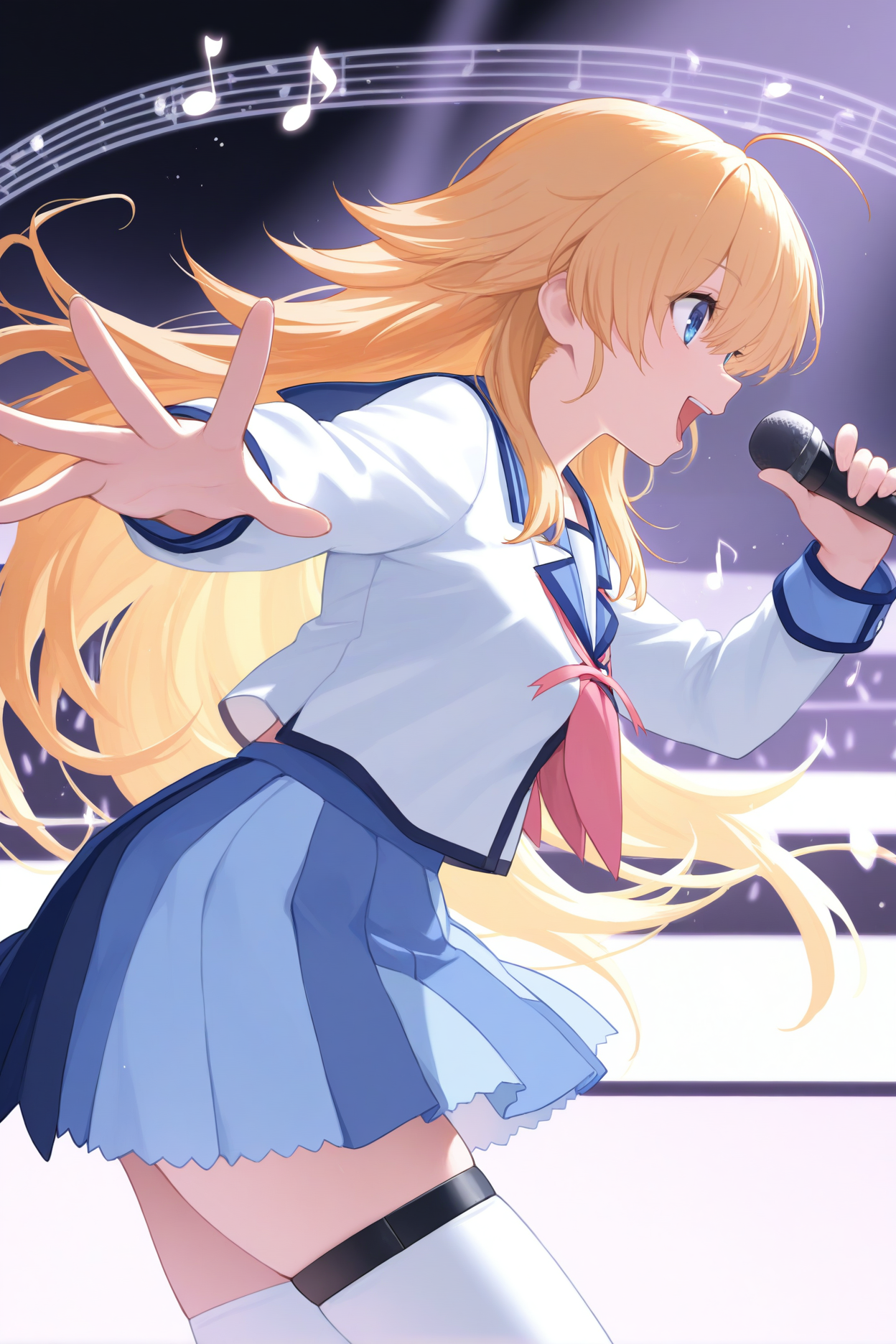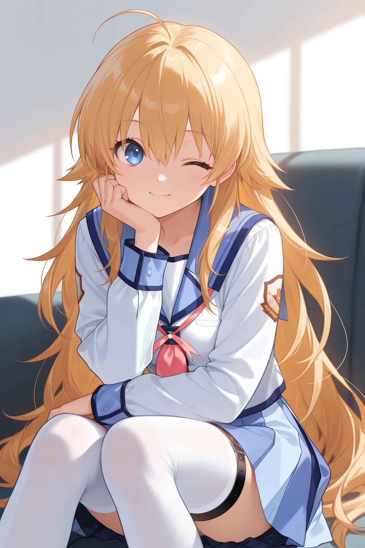 그녀의 전형적인 모습을 위해 "파란 해군 칼라, 흰 셔츠, 긴 소매, 분홍 넥커치프, 목 리본, 파란 치마, 미니 치마, 주름 치마, 다색 치마, 흰 허벅지 양말, 허벅지 스트랩, 로퍼"를 추가하세요.