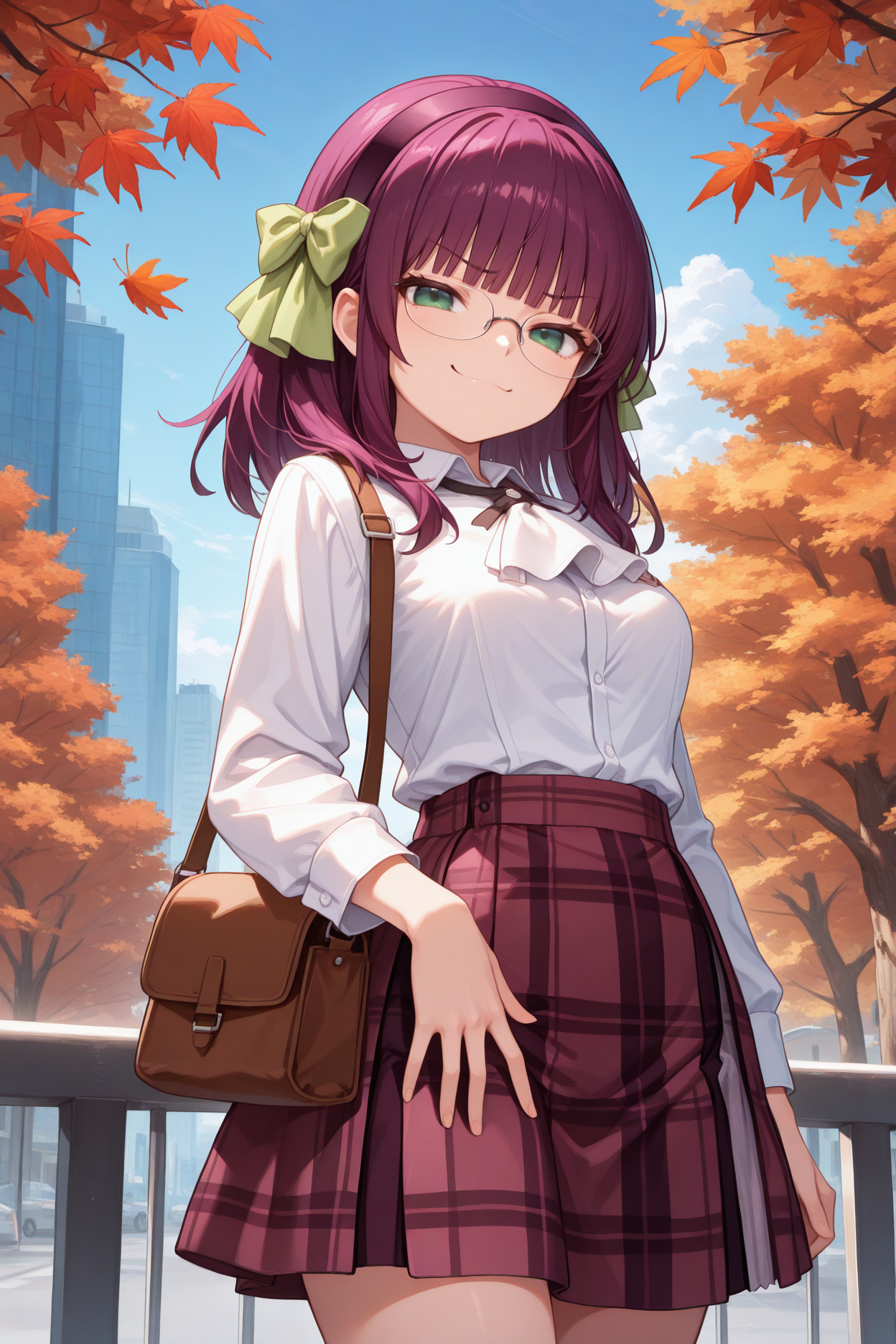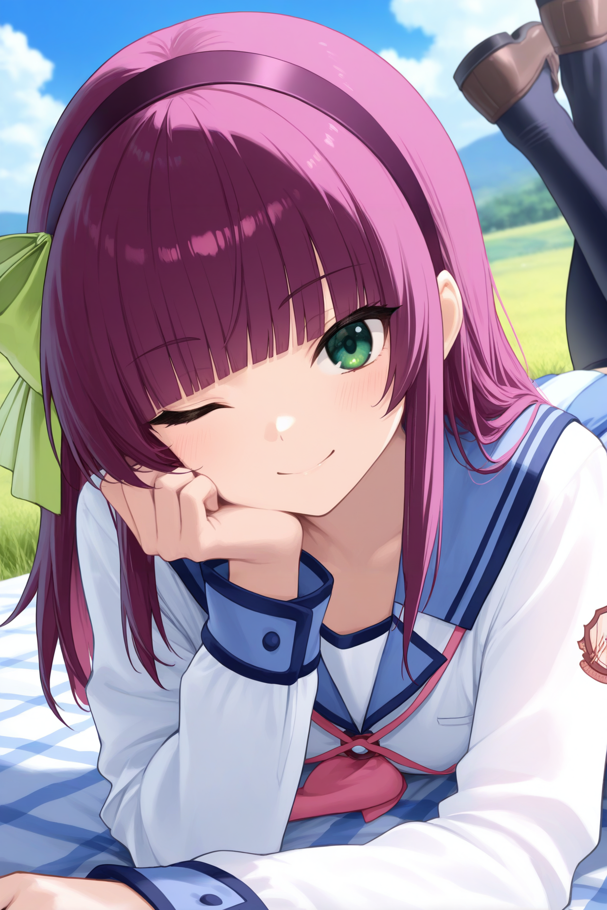 그녀의 전형적인 모습을 표현하려면 "헤어밴드, 헤어 리본, 녹색 리본, 파란색 해군 칼라, 분홍색 넥커치프, 넥 리본, 흰색 셔츠, 긴 소매, 파란 치마, 미니 스커트, 주름 치마, 다색 치마, 검은 허벅지 스타킹, 로퍼"를 추가하세요.