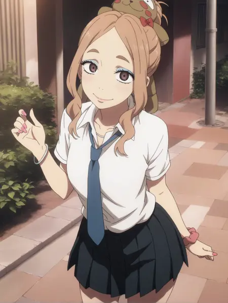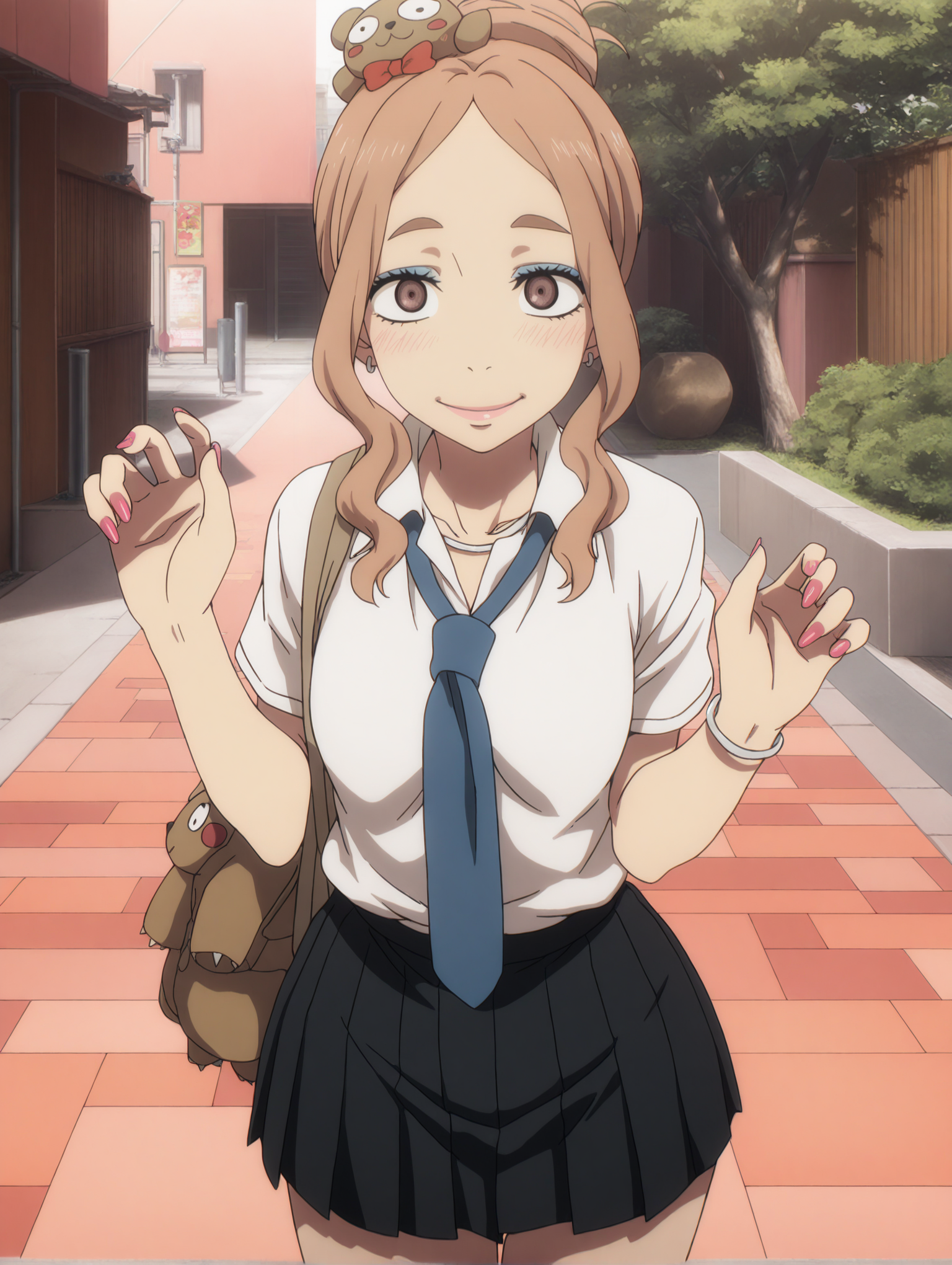 necktie,skirt,school uniform,white shirt,jewelry,nail polish,stuffed animal,stuffed toy