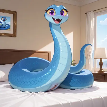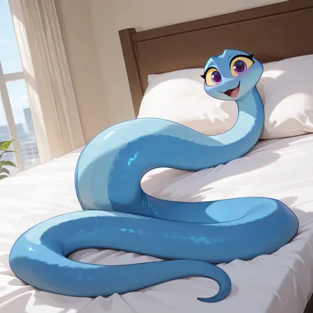 追加プロンプト:snake, blue scales, light blue underbelly, yellow sclera, purple eyes, big eyes, round head, tail, 1girl