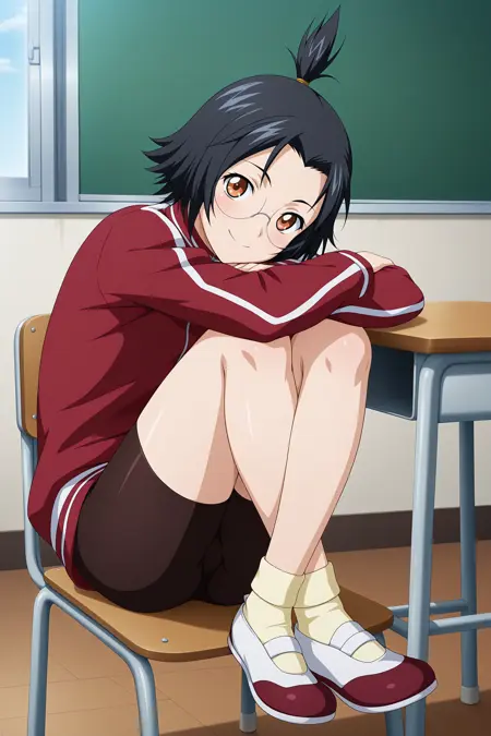 rikuson hakugen, short hair, black hair, topknot, hair tie, parted bangs, brown hair, round eyewear, long sleeves, red jacket, track jacket, high collar, black shorts, bike shorts, yellow socks, ankle socks, uwabaki