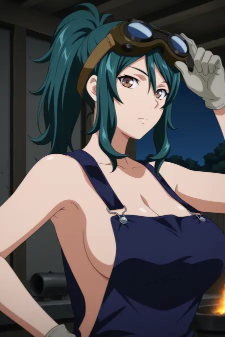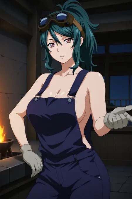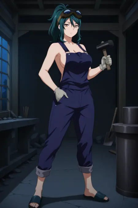 kotetsu, long hair, green hair, ponytail, sidelocks, parted bangs, hair between eyes, brown eyes, goggles on head, blue overalls, naked overalls, grey gloves, blue pants, blue footwear, slides