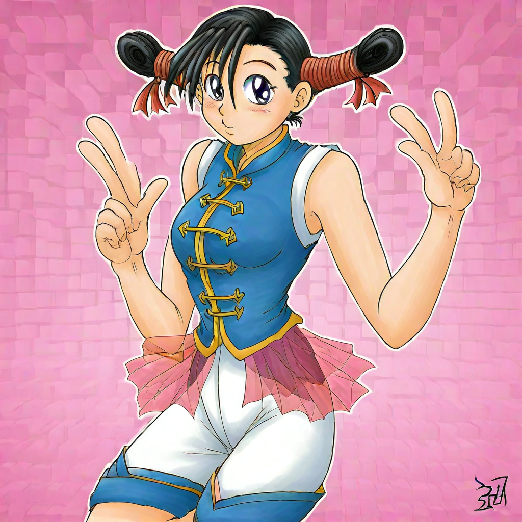 black hair, v, chinese clothes, blue chinese clothes, double v, shorts, see-through skirt, short hair, skirt, pink skirt