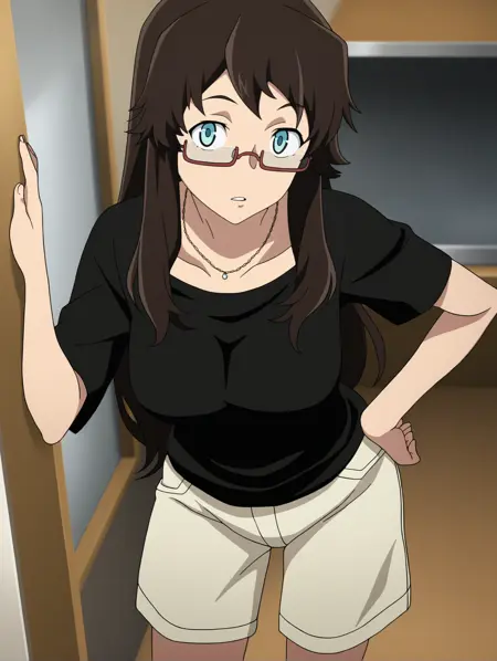 glasses,semi-rimless eyewear,red-framed eyewear,under-rim eyewear,jewelry,necklace,pendant,round collar,black shirt,short sleeves,white shorts