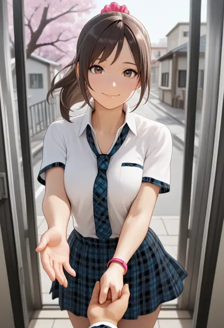 "SUMLESHIKA, brown hair, pink scrunchie, brown eyes, ponytail, white collared shirt, short sleeves, plaid necktie, plaid skirt, bracelet"