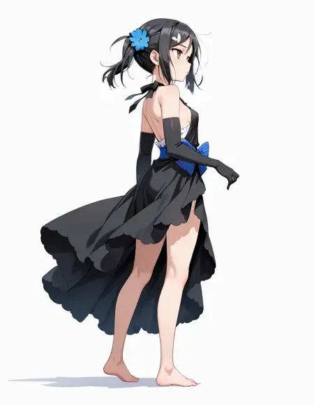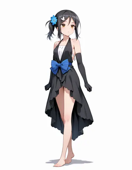 MiyuDress, drs_elbow_gloves, drs_butterfly_hair_ornament, drs_hair_flower, drs_backless_layered_dress, black dress, drs_waist_bow