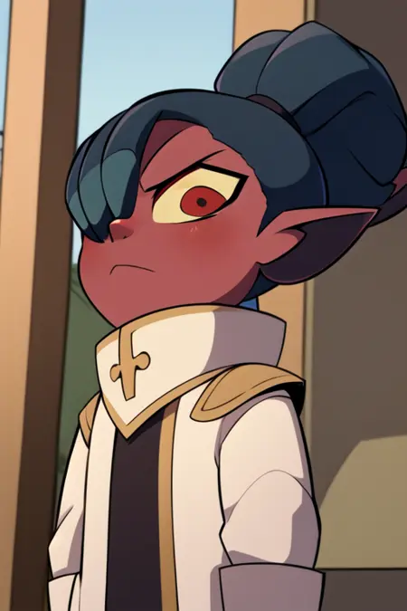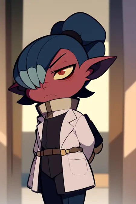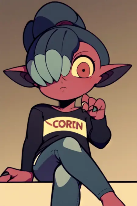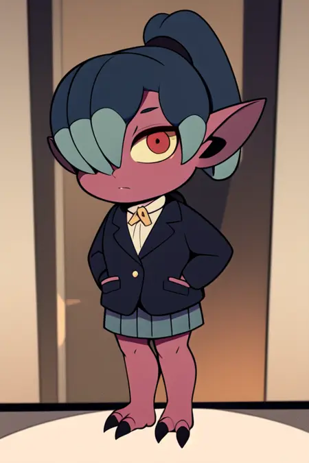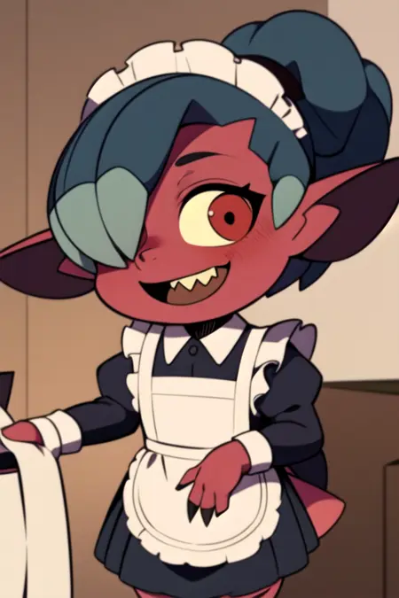kikimora, monster girl, dwarf, red skin, ponytail, hair over one eye, yellow sclera, red eyes, no humans