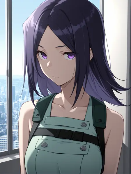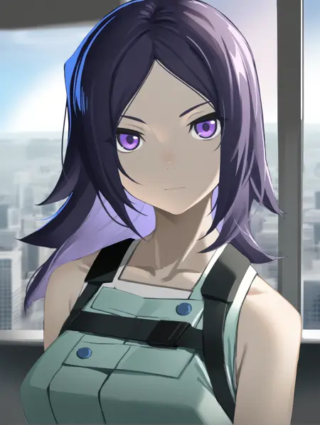 IL_Ai Mikami,1girl,solo,breasts,purple eyes,medium breasts,purple hair,parted bangs