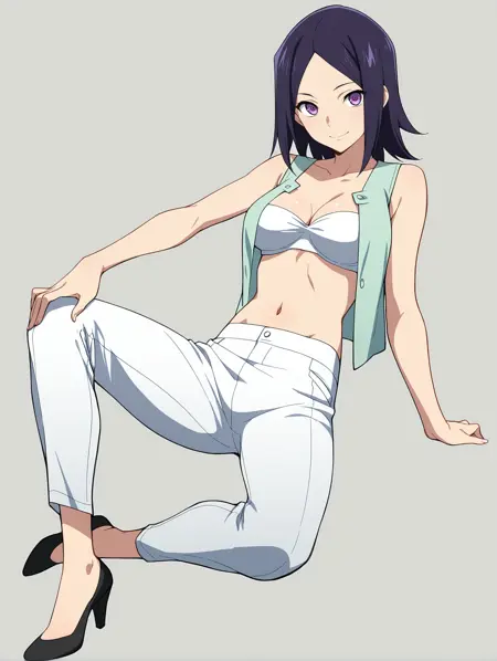通常: グリーンのベスト、ノースリーブ、お腹の一部が見える、へそ、白いズボン、黒い靴、ハイヒール