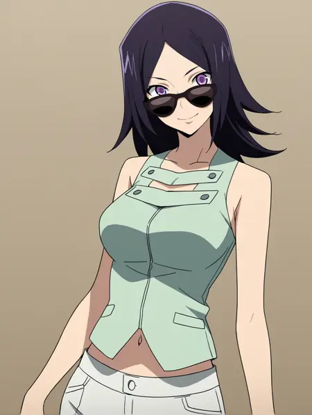 normal: green vest,sleeveless,midriff peek,navel,white pants,black shoes,high heels