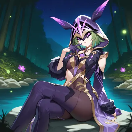 CicinMages, Elct, 绿发, 短发, 紫眼, 紫色紧身衣, 无袖紧身衣, 饰品, 紫色外套, 带帽外套, 毛皮镶边外套, 黑色皮毛, 毛皮镶边袖子, 紫色袖子, 金色项圈, 手臂镂空, 吊坠, 衣服镂空, 脐上镂空, 紫色宝石, 金色镶边, 紫色镶边, 宽袖, 半指手套, 紫色手套, 动物帽兜, 紫色帽兜, 眼罩, 面具, 眼睛遮盖, 锁骨, 紫色鞋履, 大腿靴,