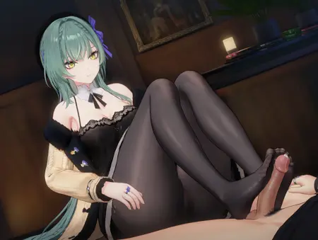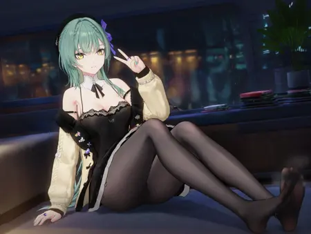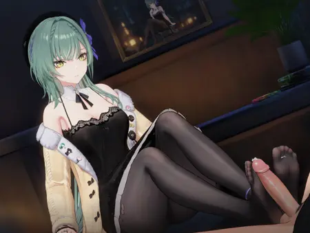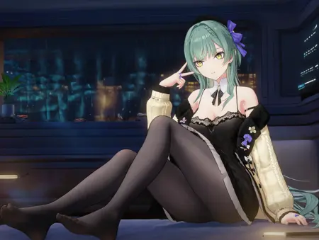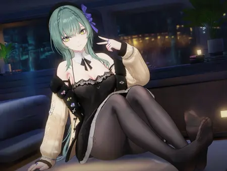 Thoth,<lora:tuote5464:1>,absurdres,official style,more details,long hair,pantyhose,dress,off shoulder,black pantyhose,black dress,picture frame,jacket,no shoes,bare shoulders,jewelry,hat,yellow eyes,open jacket,spaghetti strap,1girl,beret,detached collar,open clothes,indoors,green hair,arm strap,hair ornament,black headwear,ring,flower,sleeveless,very long hair,feet,