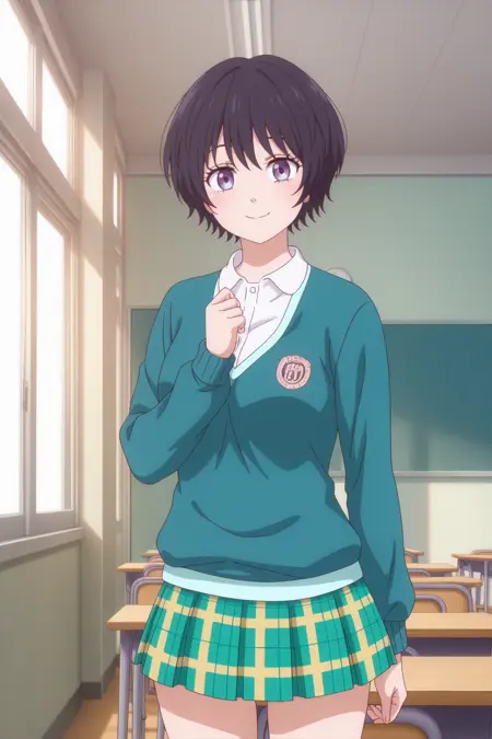 aatsubomi, purple eyes, black hair, short hair, tsubomicardigan, school uniform, white dress shirt, green sweater, green skirt, plaid skirt, pleated skirt, anime coloring,