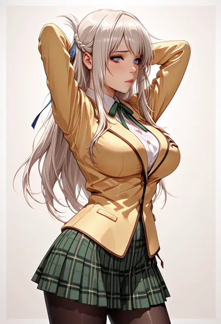 | 학습된 단어 | makabem1dori, braided hair, platinum hair, sidehair, spiky Bangs,thin blue hair ribbon, violet eyes, big eyes,detailed eyes,glossy eyes,large breasts,복사됨! blazer school uniform,green neck ribbon, white undershirt, yellow jacket,closed jacket,green checked skirt,pleated skirt, black pantyhose복사됨! |