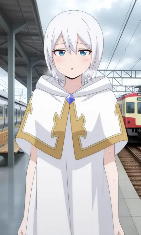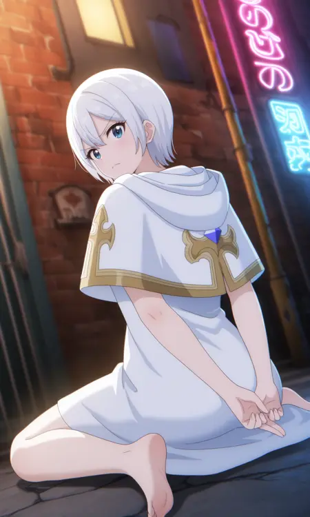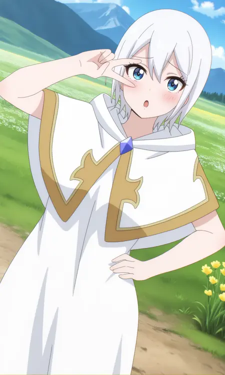 l1s4nstrcnc, blue eyes, white hair, short hair, white coat, sleeveless coat, hooded coat, blue gem, brooch,