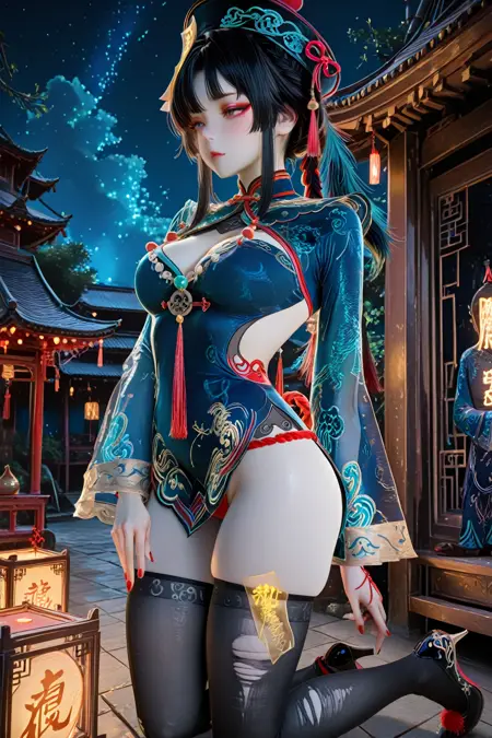 触发词(Trigger word)****: dress,black thighhighs,torn thighhighs,long sleeves,jewelry,tassel,clothing cutout,blue_dress,breasts,china dress,torn clothes,cleavage cutout,high heels,jiangshi,ofuda,skindentation,
