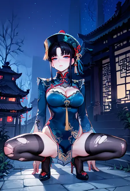 触发词(Trigger word)****: dress,black thighhighs,torn thighhighs,long sleeves,jewelry,tassel,clothing cutout,blue_dress,breasts,china dress,torn clothes,cleavage cutout,high heels,jiangshi,ofuda,skindentation,