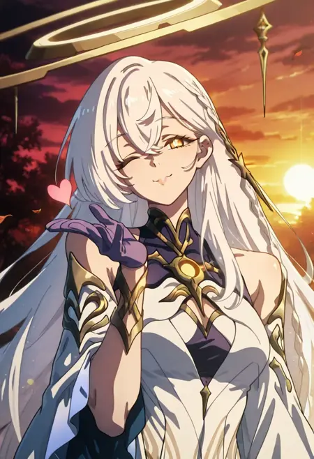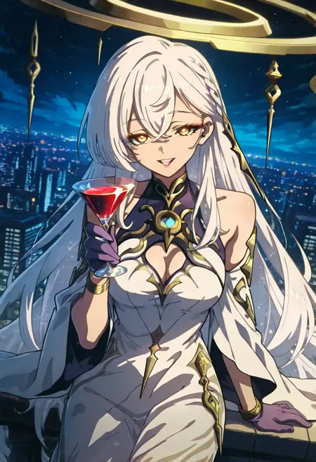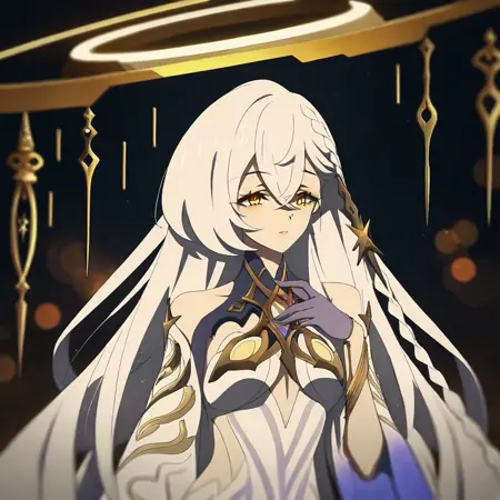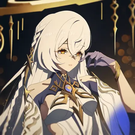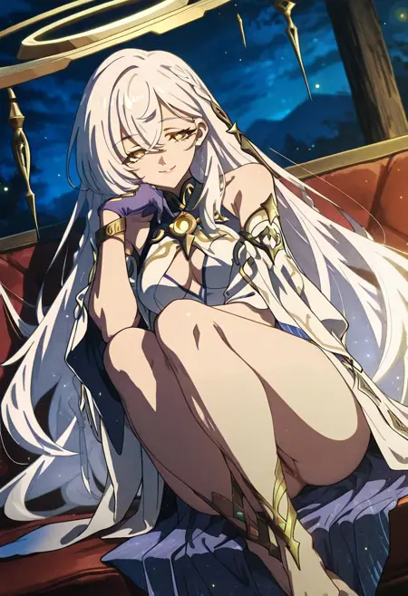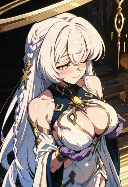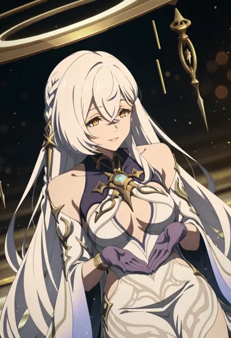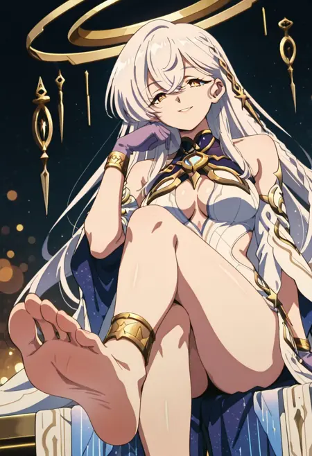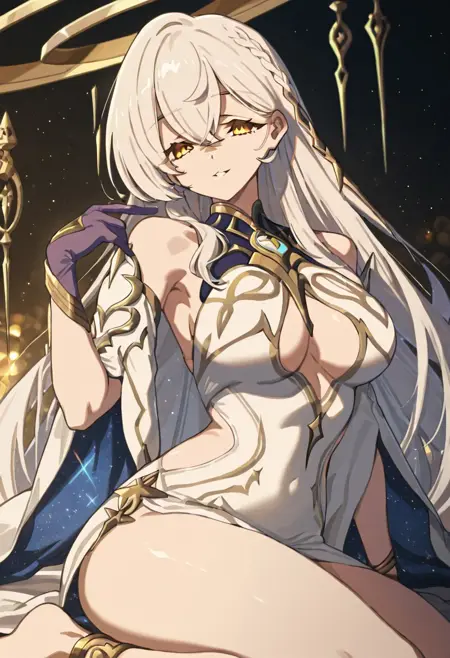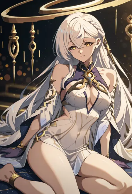 IstarothGI, 1소녀, 혼자, 하얀 머리카락, 매우 긴 머리카락, 머리 장식, 앞머리, 땋은 머리, 눈 사이의 머리카락, 황갈색 눈, 입, 환상, 광륜, 보석, 흰 드레스, 드레스 장식, 넓은 소매, 큰 가슴, 분리형 소매, 드러난 어깨, 보라색 장갑, 팔찌, 젖가슴 절개, 할터 드레스, 절개 드레스, 두꺼운 허벅지, 맨발, 발목줄,